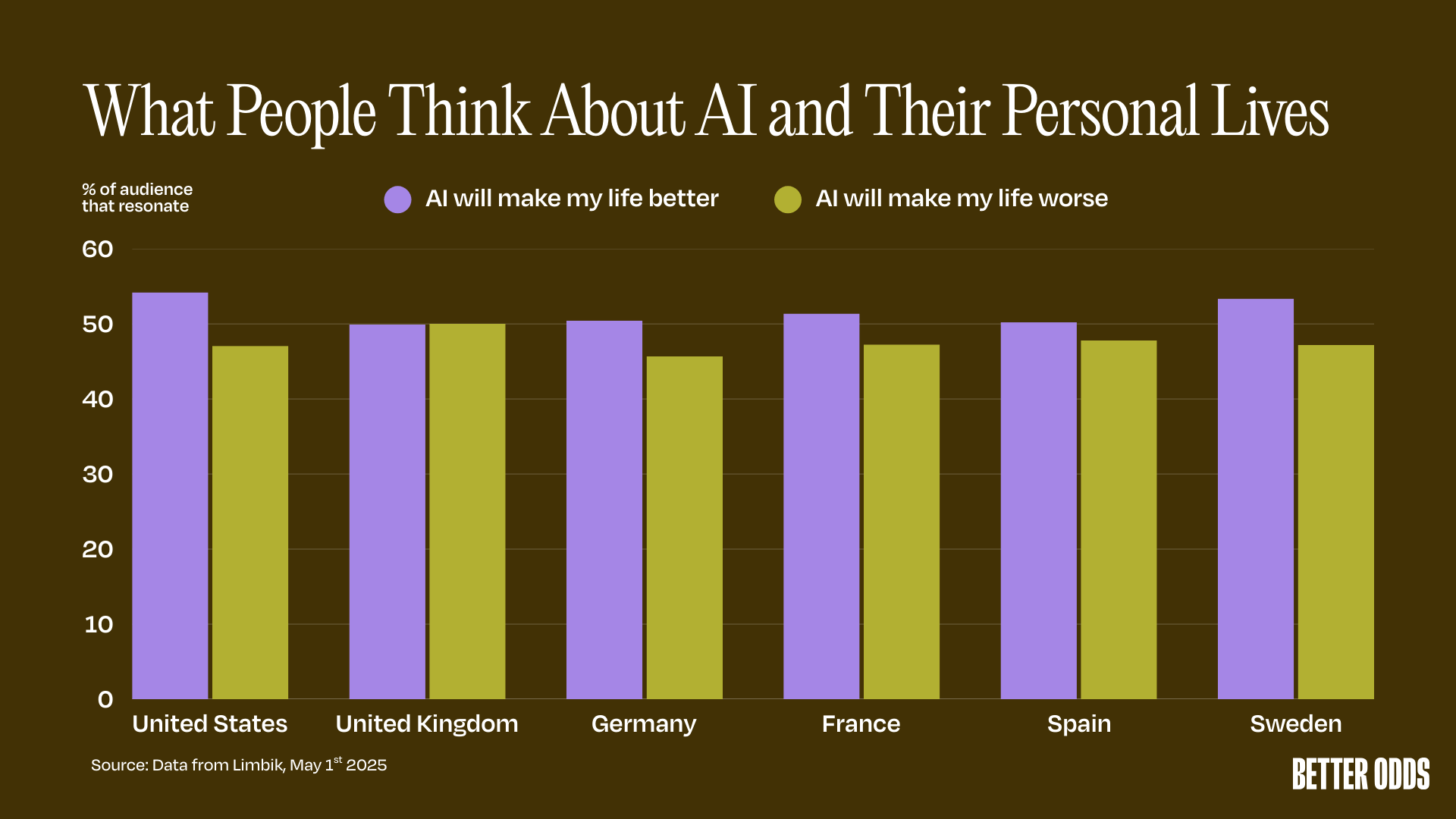 This optimism is most pronounced in the United States, where 54.20% believe the statement “AI will make my life better”, compared to only 47.07% who think it will worsen their lives. Sweden follows closely behind in this optimistic outlook. The UK stands out as the most ambivalent, with nearly identical percentages seeing AI as beneficial and harmful to their personal lives (49.92% vs 50.02%).