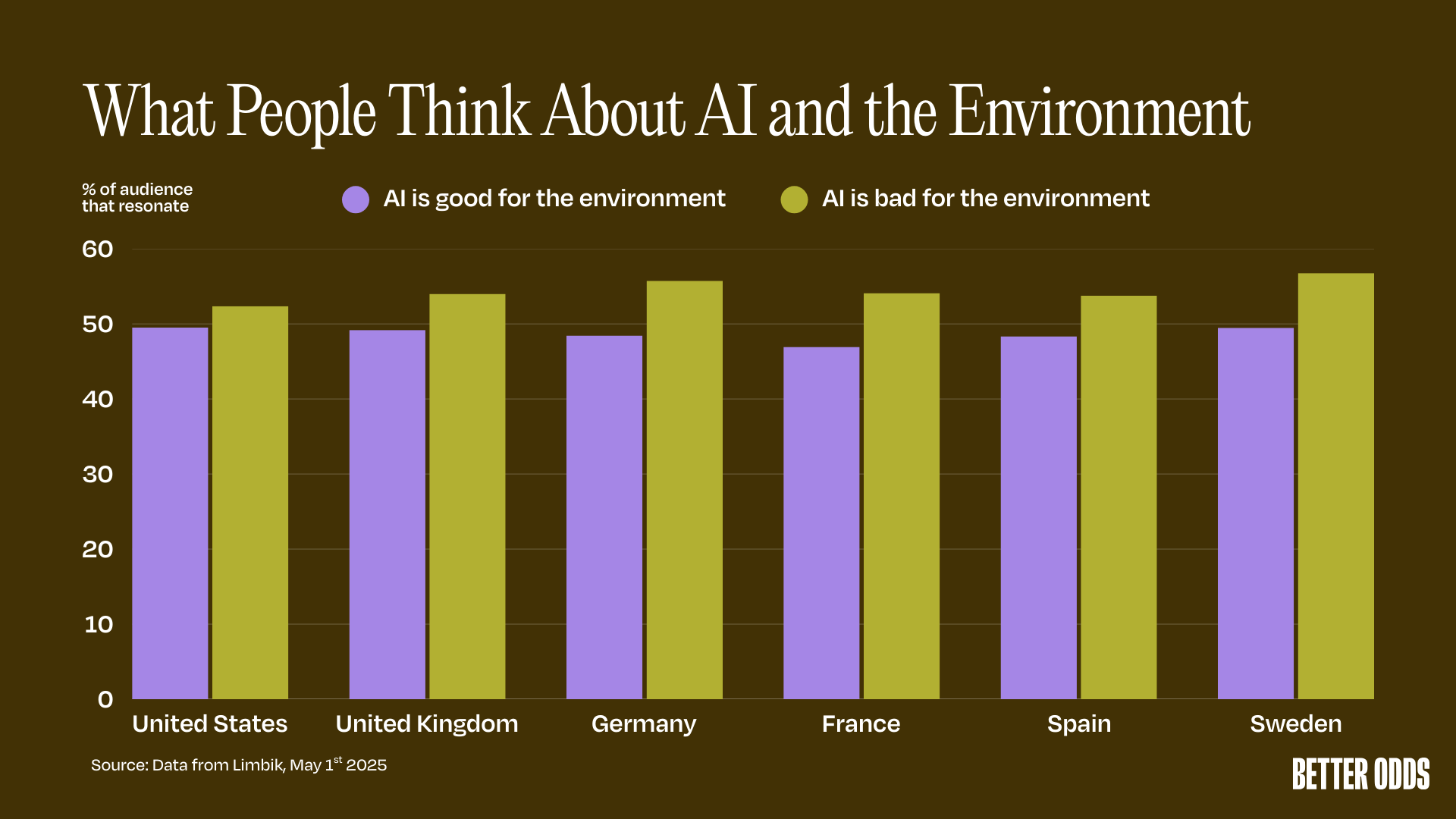 - Sweden: Swedish respondents display the highest environmental concern about AI but are also among the most optimistic about its benefits—a particularly stark example of the mixed feelings phenomenon.